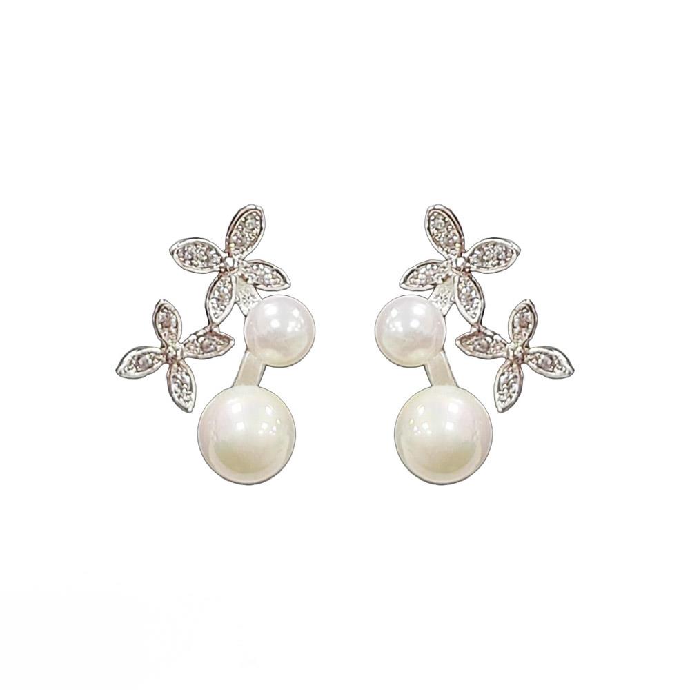 RHINESTONE CUBIC ZIRCONIA PEARL FLOWER FOUR LEAF EARRING