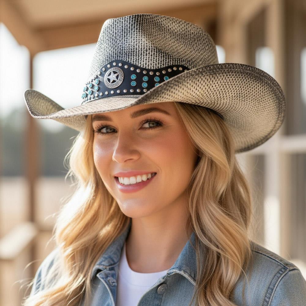 RUSTIC STRAW COWBOY HAT WITH SILVER AND TURQUOISE STUDS FAUX LEATHER BAND
