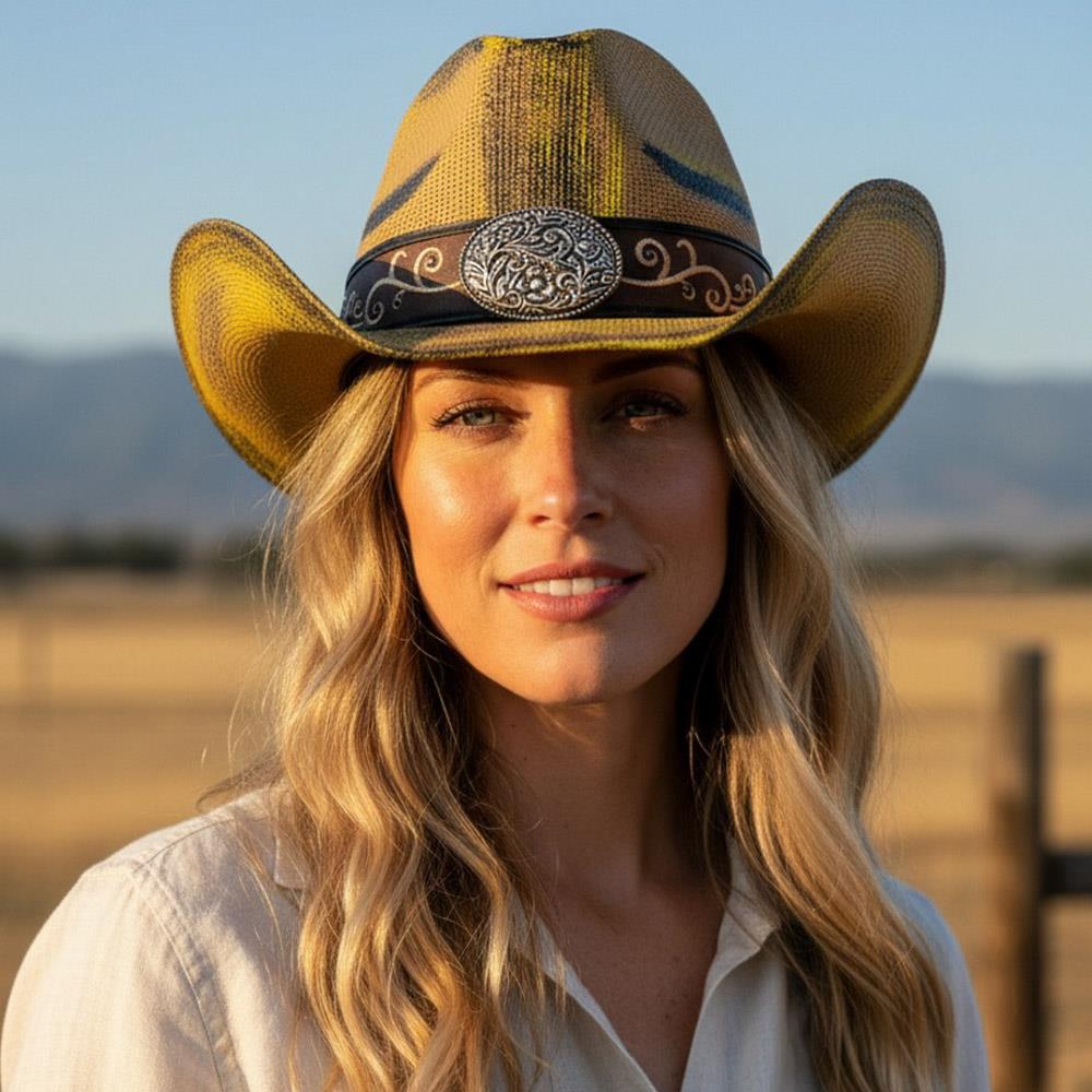 ANTIQUE WASH STRAW COWBOY HAT WITH ORNATE OVAL BUCKLE FAUX LEATHER BAND