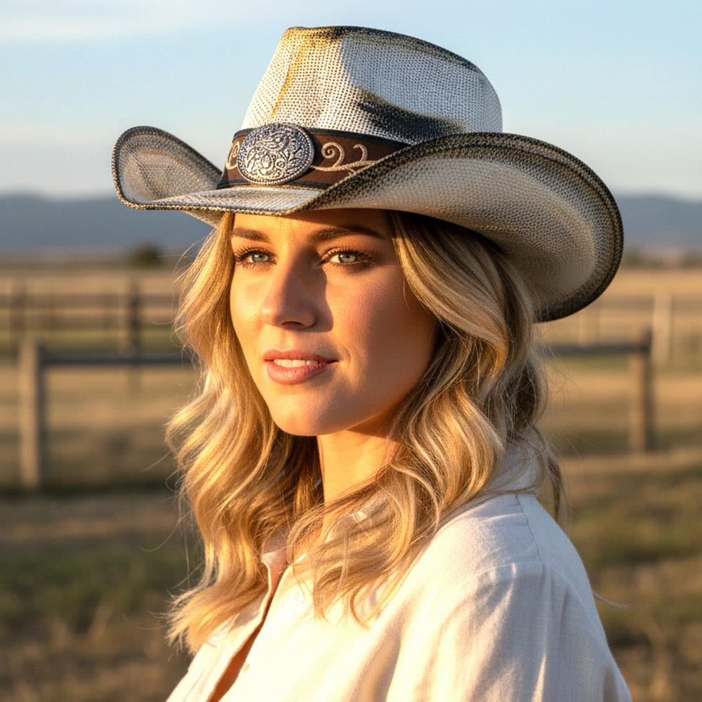 DISTRESSED STRAW COWBOY HAT WITH ORATE FAUX LEATHER BAND