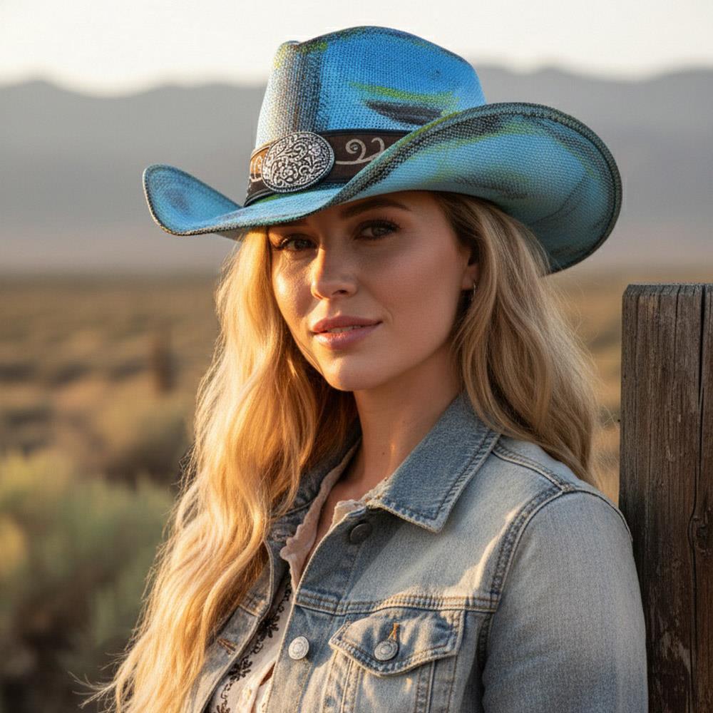 WASHED STRAW COWBOY HAT WITH TURQUOISE ACCENT AND UNDERSIDE PATTERN DETAIL