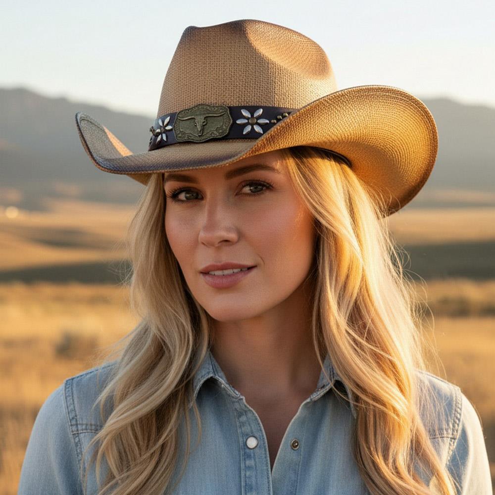 DISTRESSED STRAW COWBOY HAT WITH METAL BULL BUCKLE