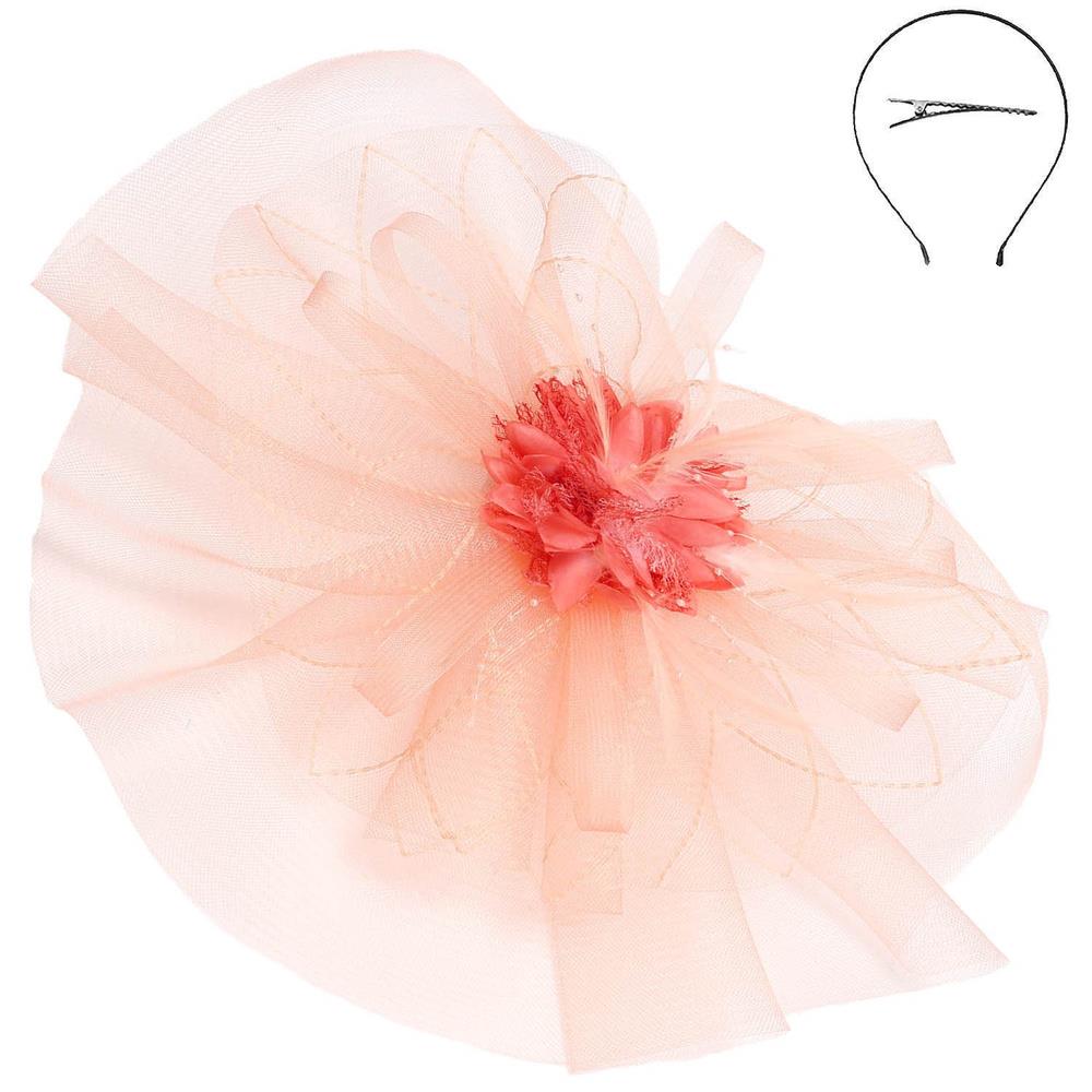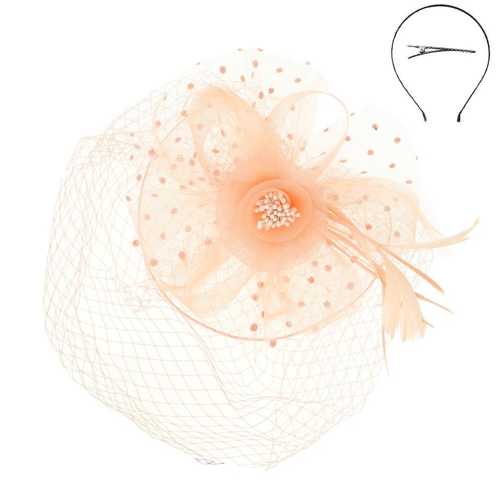 FEATHER RIBBON FLORAL POLKA DOT MESH NETTING VEIL FASCINATOR WITH HEADBAND AND CLIP