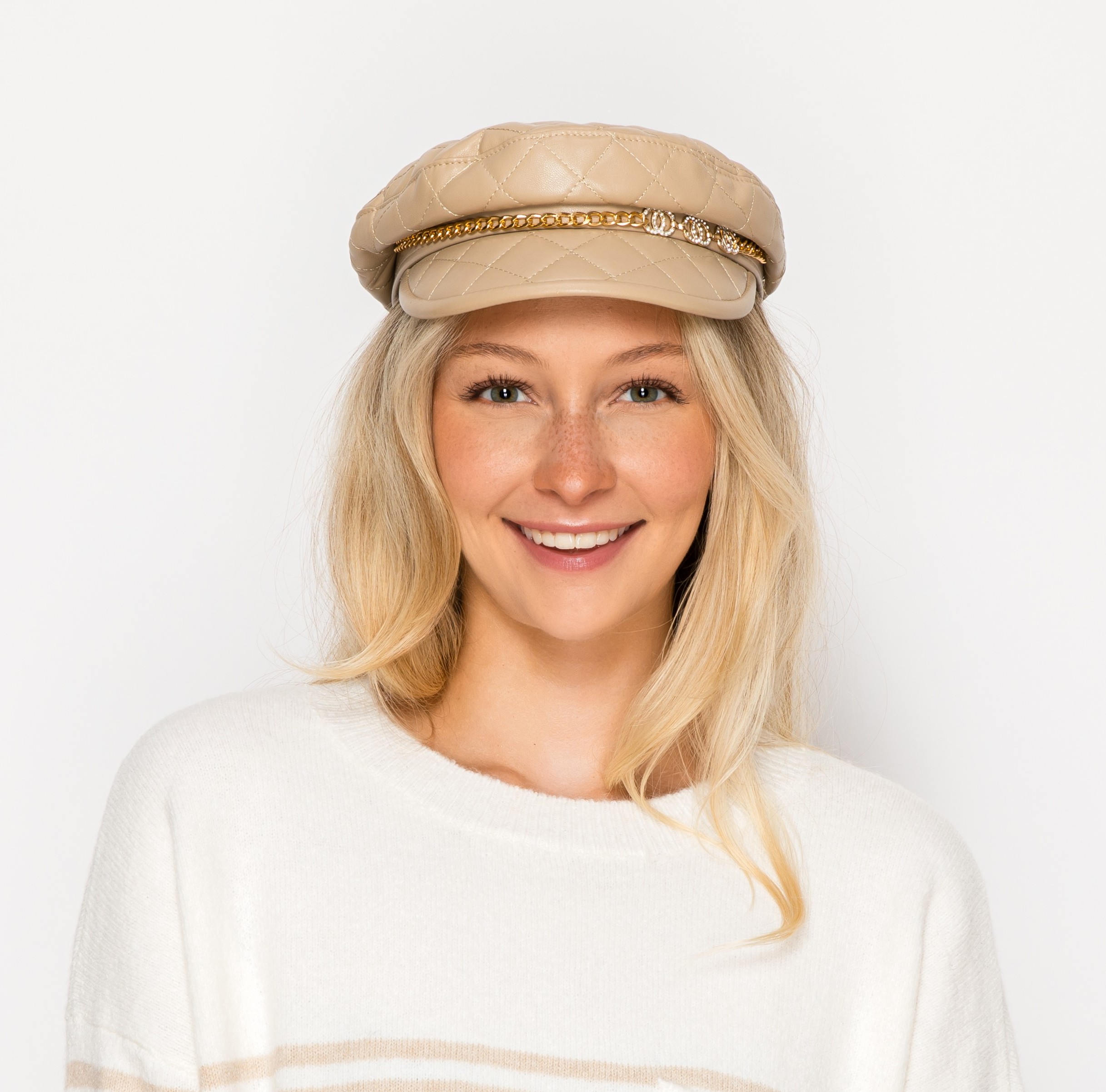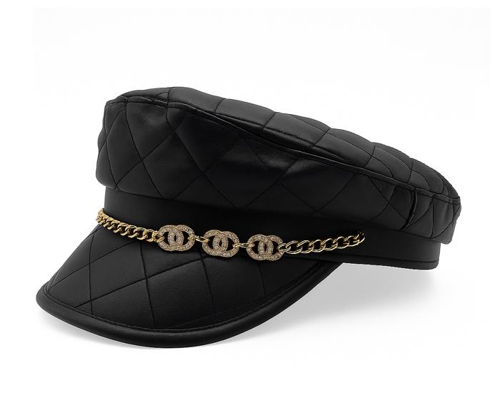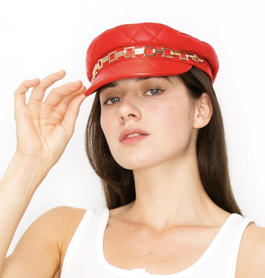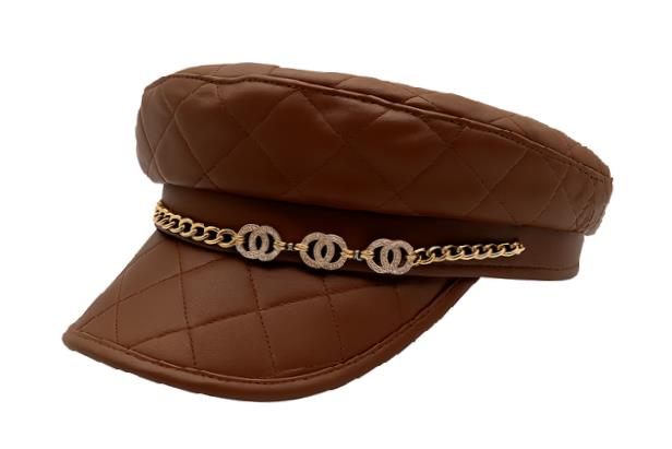 QUILTED FAUX LEATHER CHAIN DETAIL CABBIE NEWSBOY BERET HAT