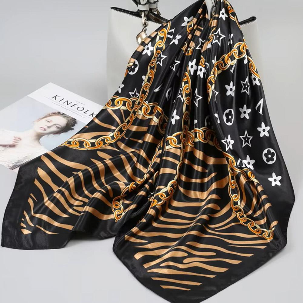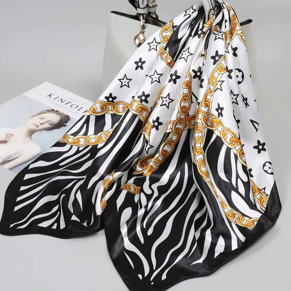 ZIBRA METAL CHAIN FLOWER PATTERN SILKY BANDANA SQUARE NECK SCARF