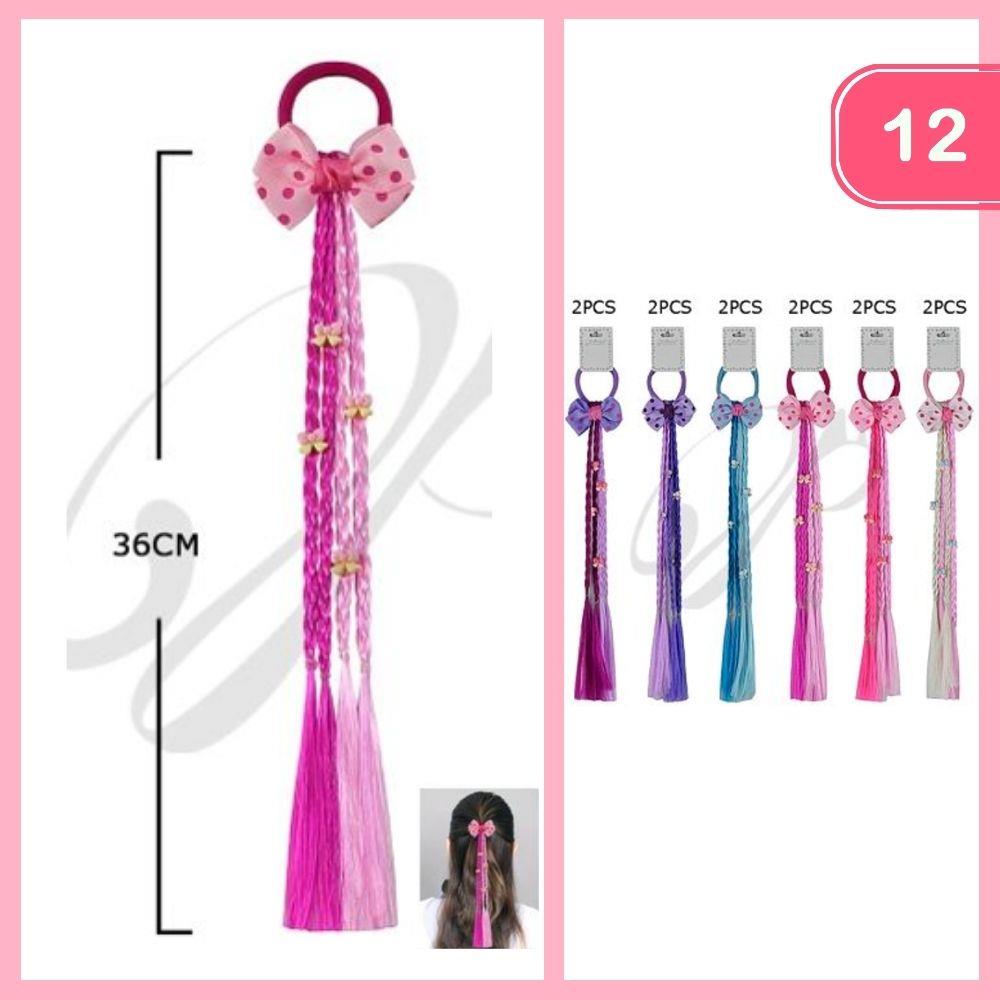 GIRLS BRAIDED PONYTAIL HAIR EXTENSION WITH POLKA DOT BOW AND DECORATIVE CLIPS HAIR TIE (12 UNITS)
