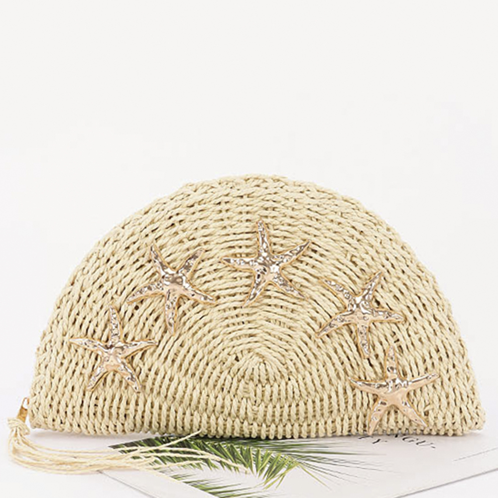 STRAW HALF MOON CLUTCH W STARFISH EMBELLISHMENTS