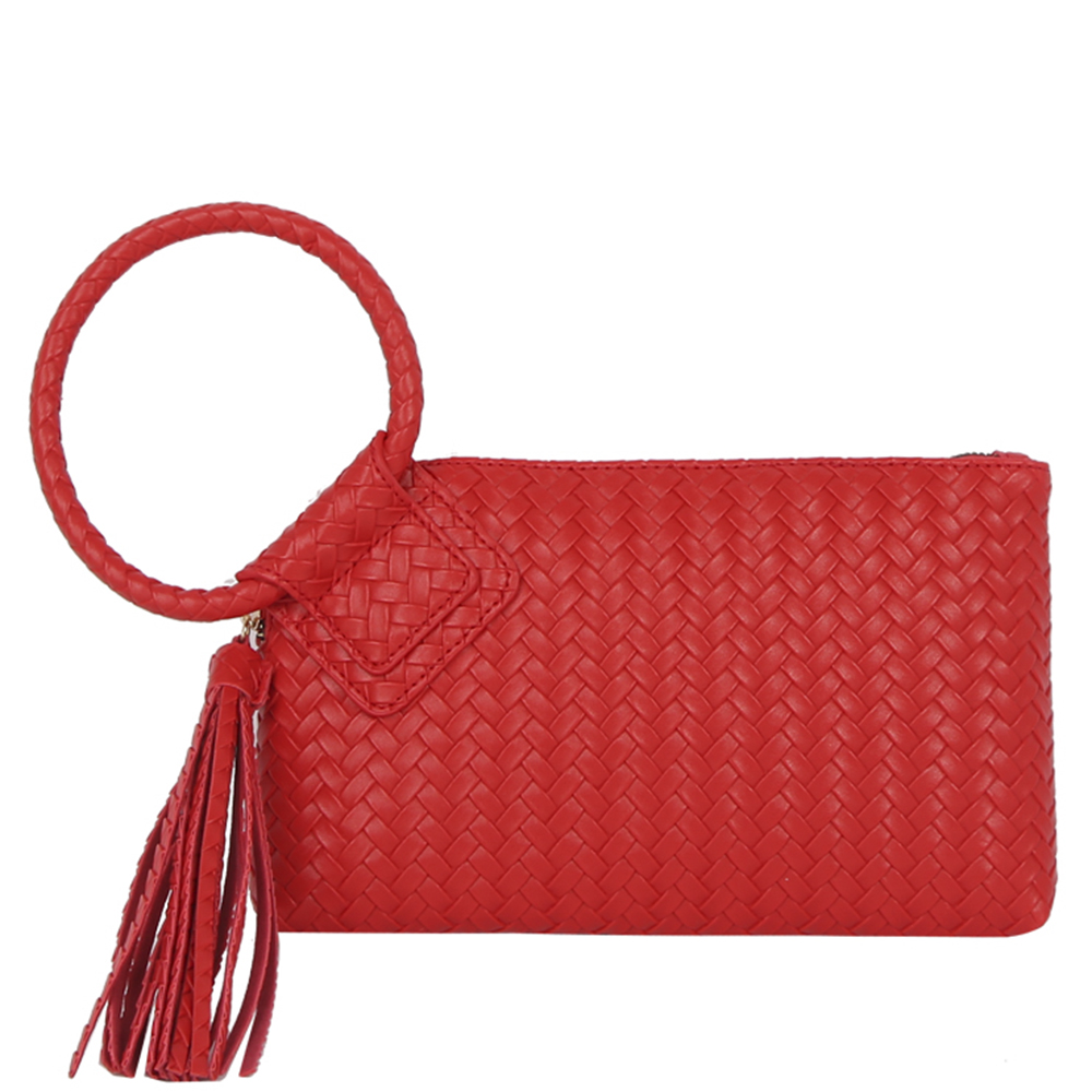 TEXTURED WOVEN WRISTLET FRINGE CLUTCH BAG