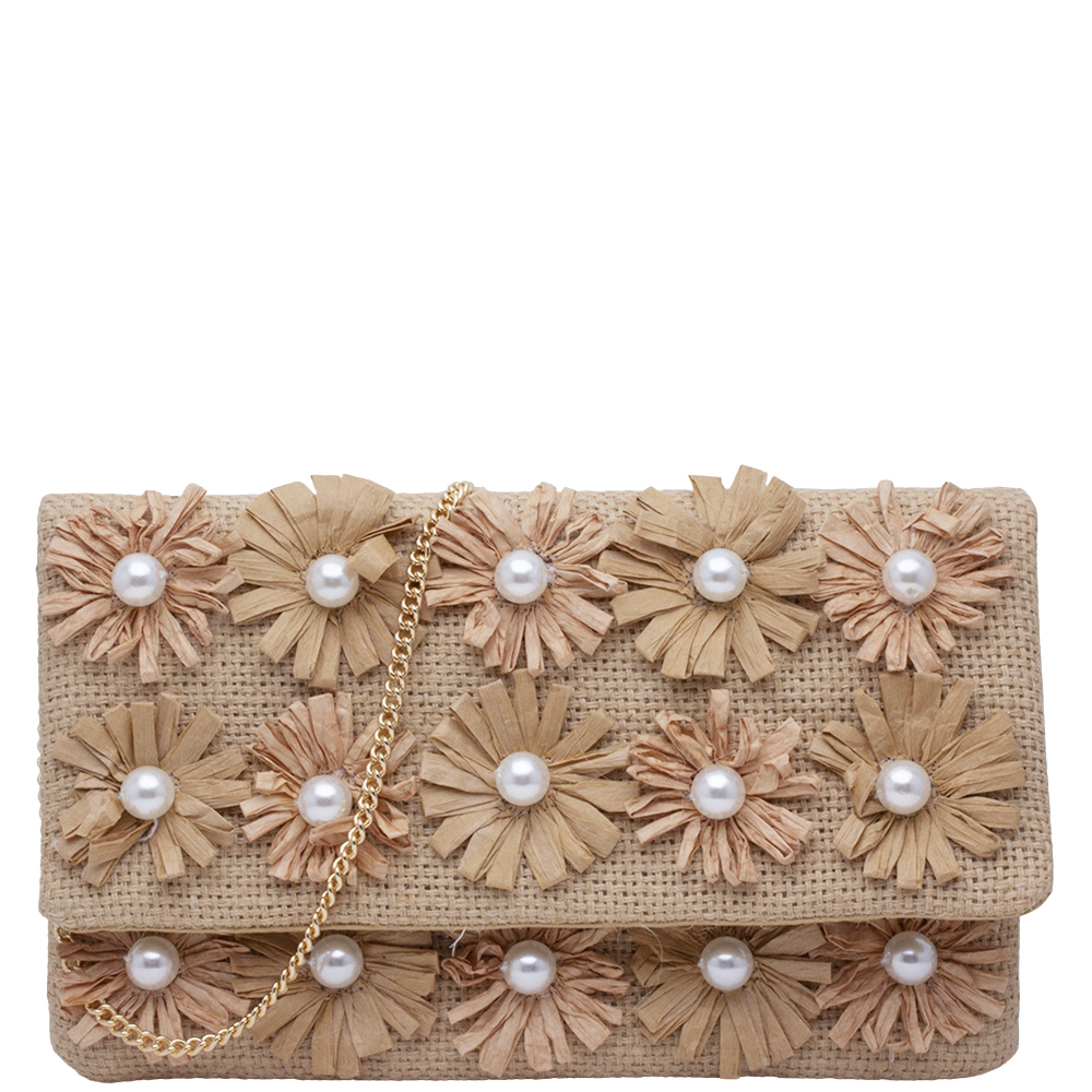 FLORAL PEARL DECORATED RAFFIA CLUTCH BAG