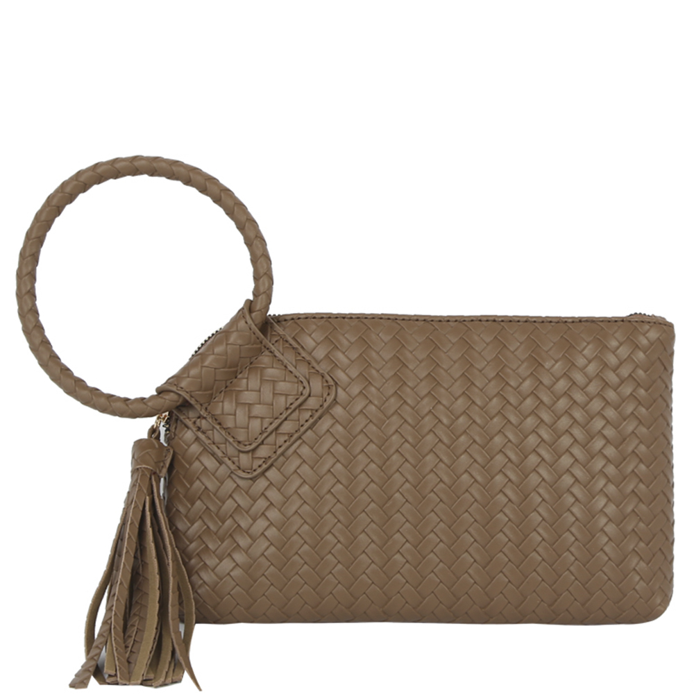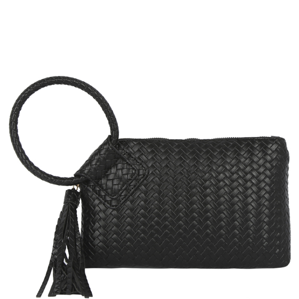 TEXTURED WOVEN WRISTLET FRINGE CLUTCH BAG
