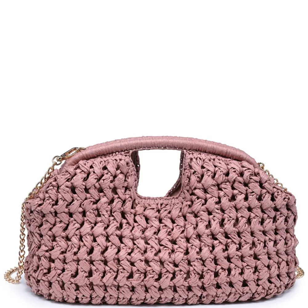 FAUX STRAW HALF-MOON CLUTCH WITH SHELL EMBELLISHMENTS