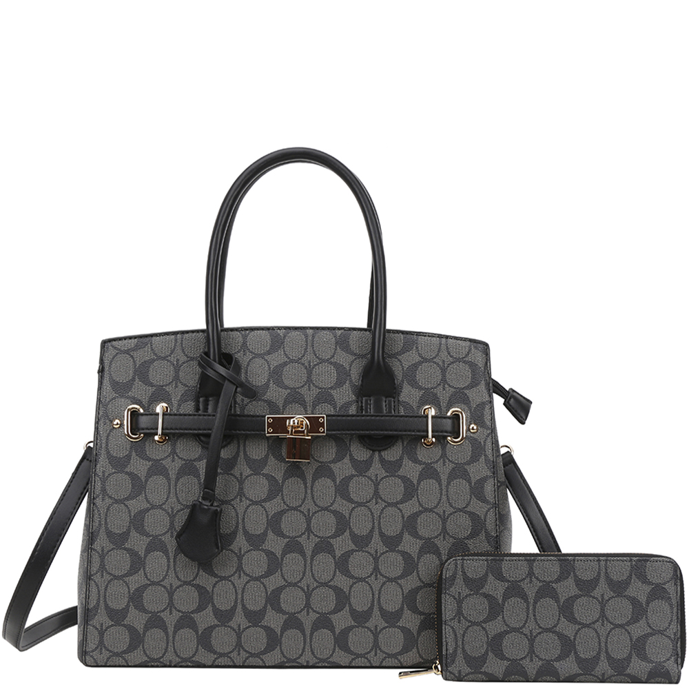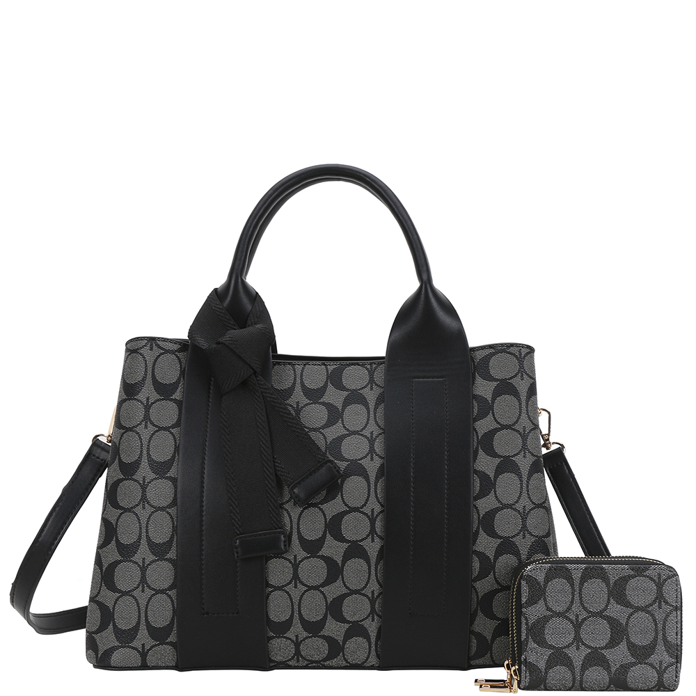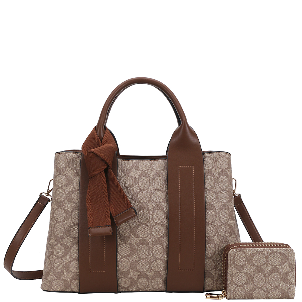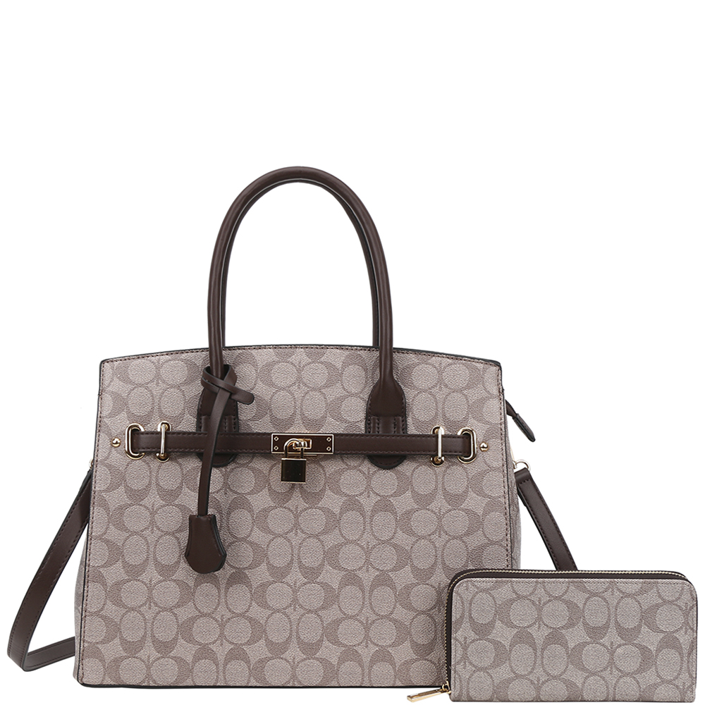 2IN1 MONOGRAM DESIGN TEXTURE HANDLE SATCHEL W WALLET SET