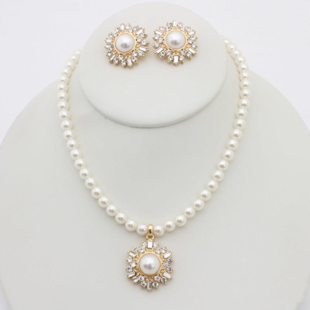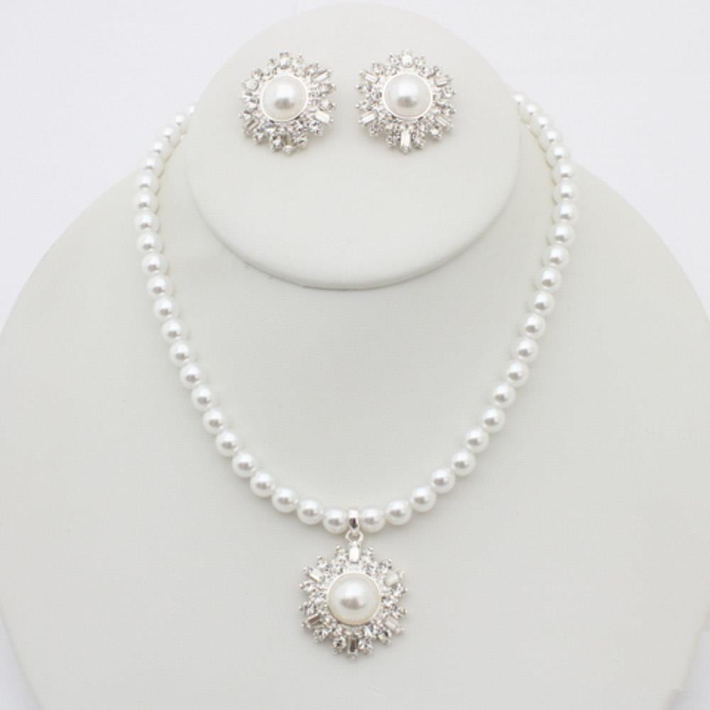 PEARL BEAD RHINESTONE ROSE PENDANT NECKLACE EARRING SET