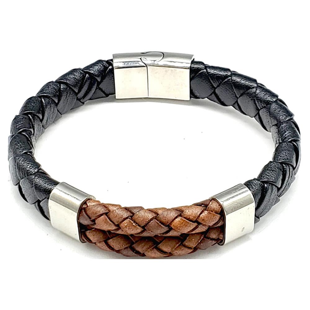UNISEX STAINLESS STEEL BLACK & BROWN LEATHER MIXED BRAIDED BRACELET