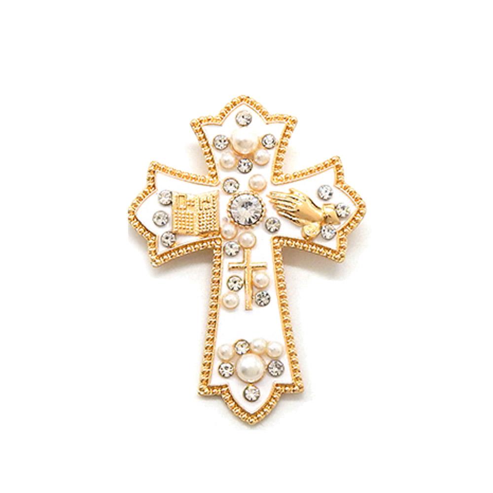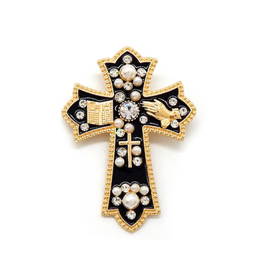 AN ELABORATE CROSS BROOCH FEATURING PEARL AND CRYSTAL ACCENTS SET AGAINST A DARK BACKGROUND WITH RELIGIOUS SYMBOLS