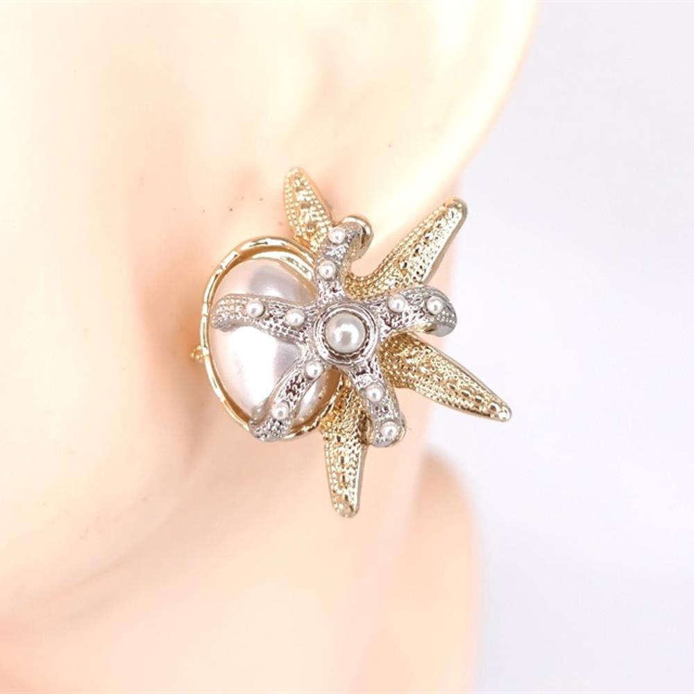 STARFISH SEASHELL METAL PEARL BEAD DANGLE EARRING