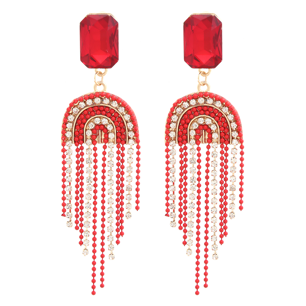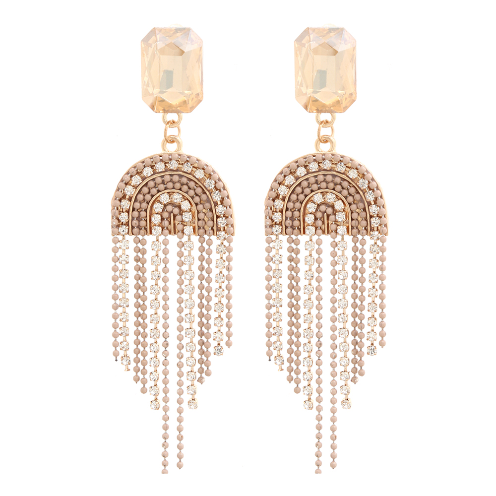 RHINESTONE BEAD U TASSEL DANGLE EARRING