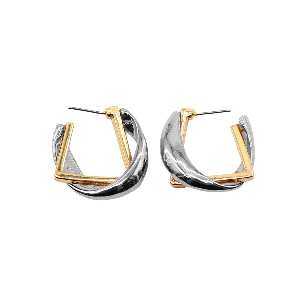 TEXTURED METAL TWO TONE DOUBLE HOOP STUD EARRINGS