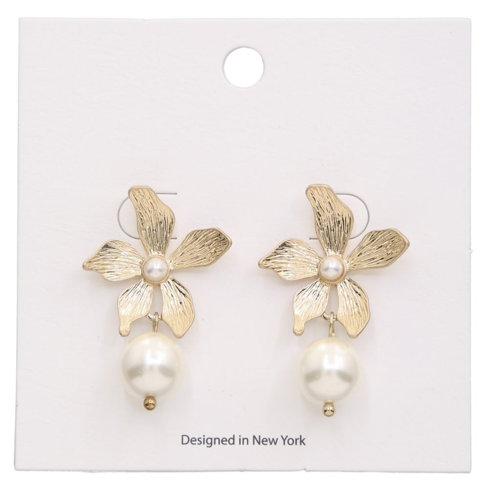 PEARL BEAD FLOWER METAL DANGLE EARRING