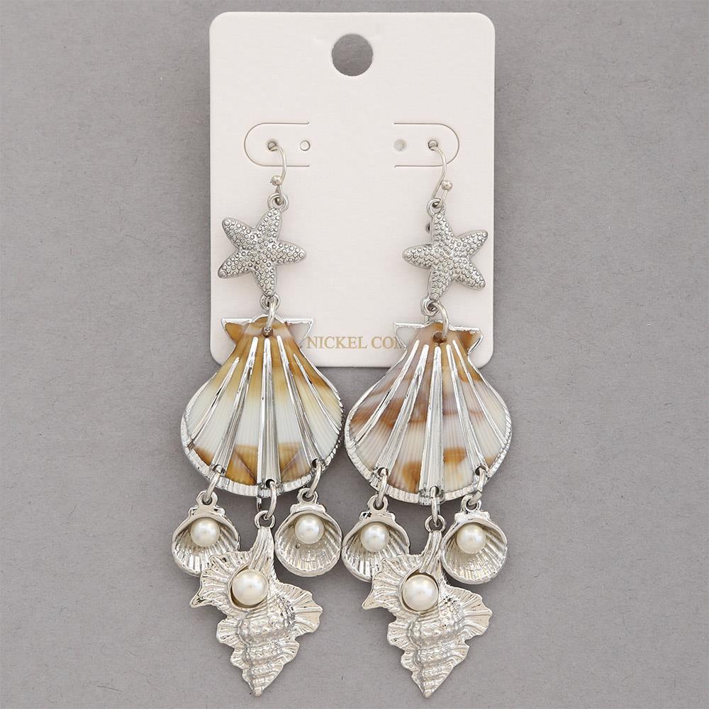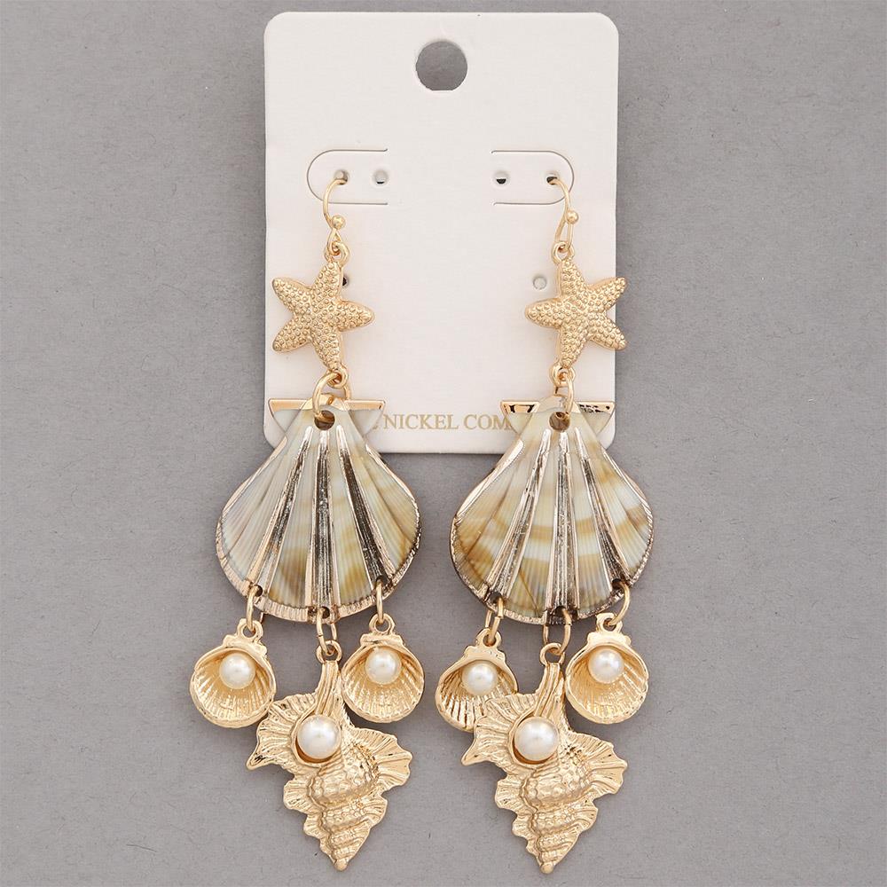 STARFISH SEASHELL METAL PEARL BEAD DANGLE EARRING