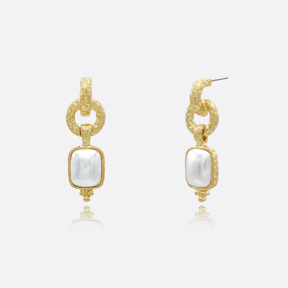 TEXTURED METAL RECTANGLE FRAME PEARL DANGLE EARRINGS