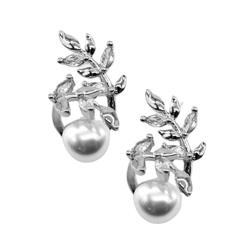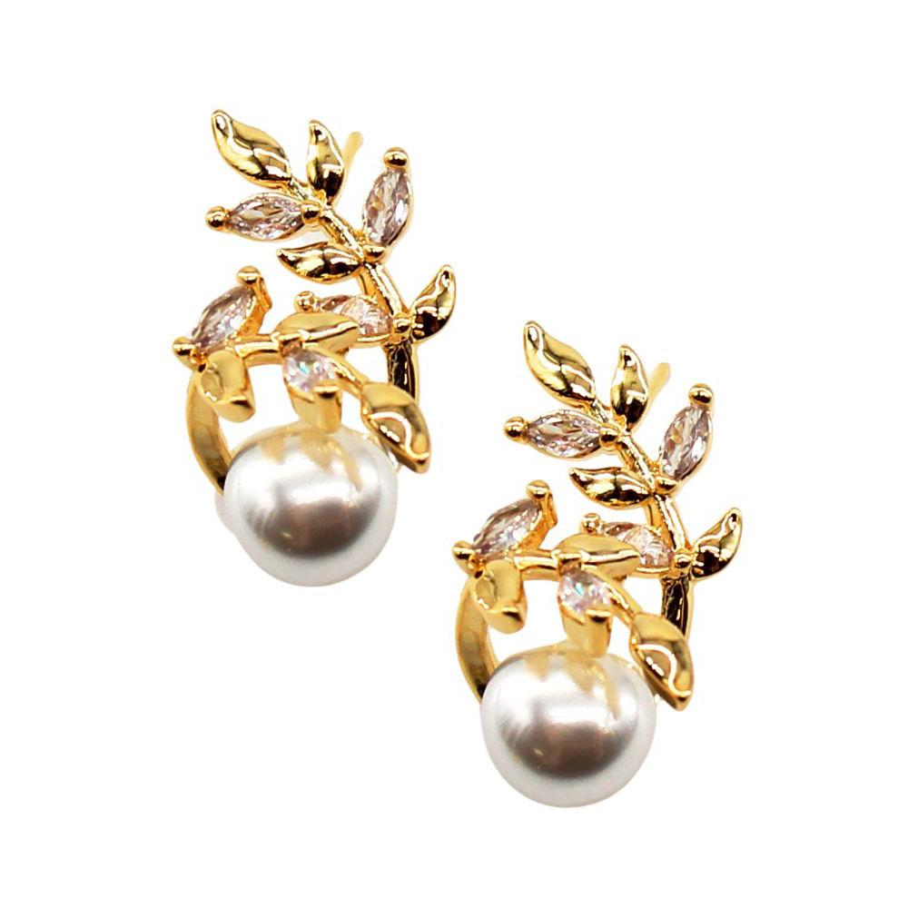 SODAJO PEARL BEAD LEAF CZ GOLD DIPPED STERLING SILVER POST EARRING