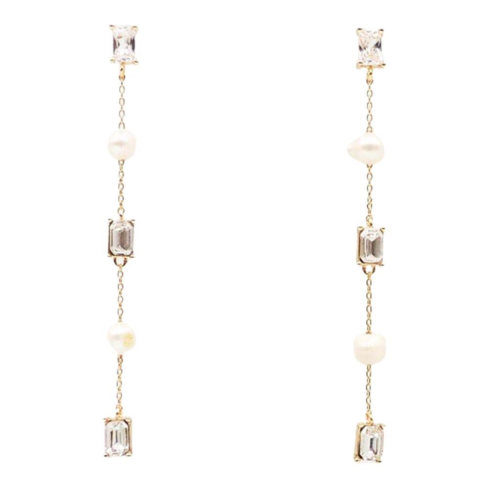 RECTANGLE CZ WITH BEAD PEARL STUD EARRING