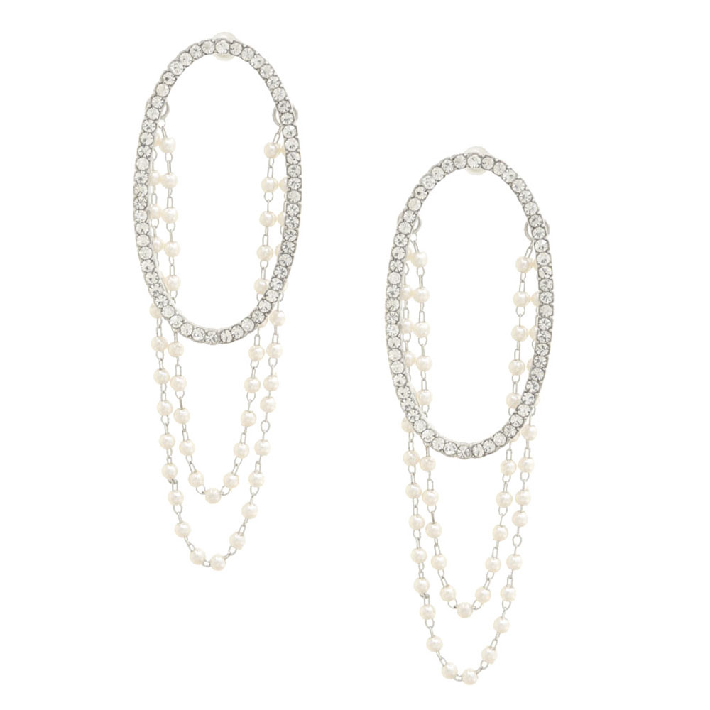RHINESTONE OVAL PEARL CHAIN DANGLE EARRING
