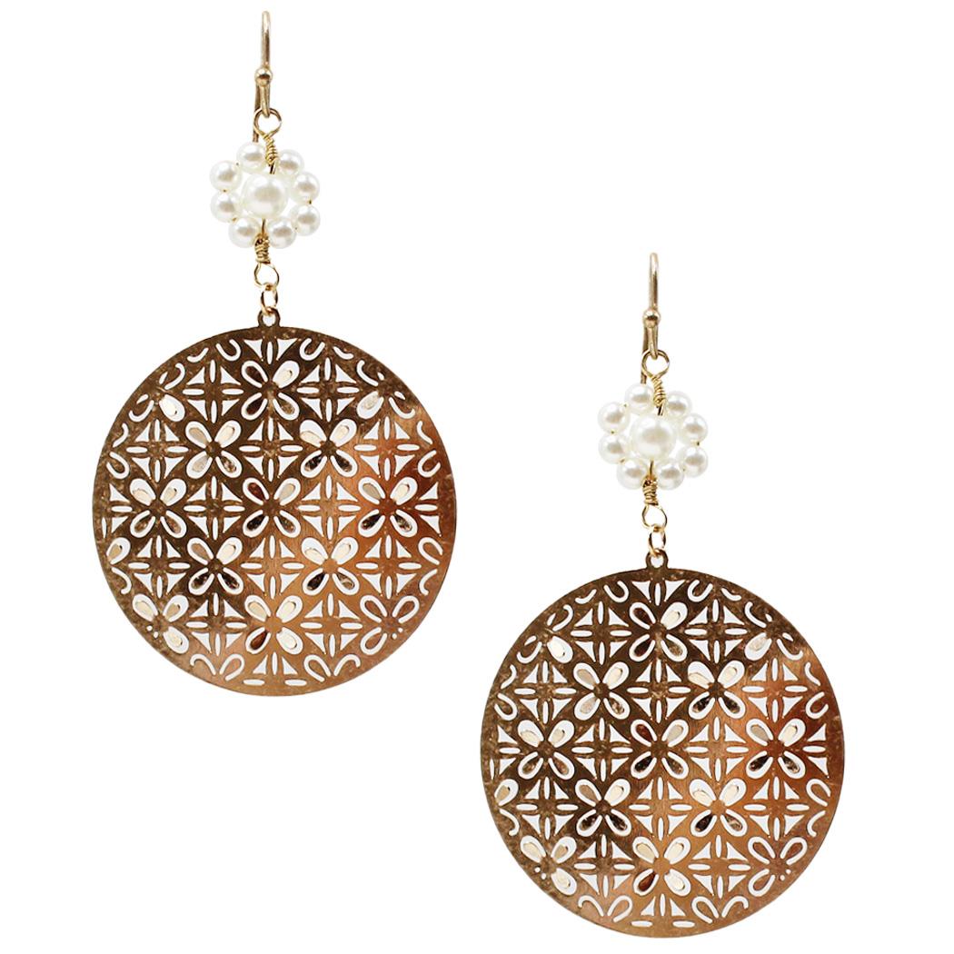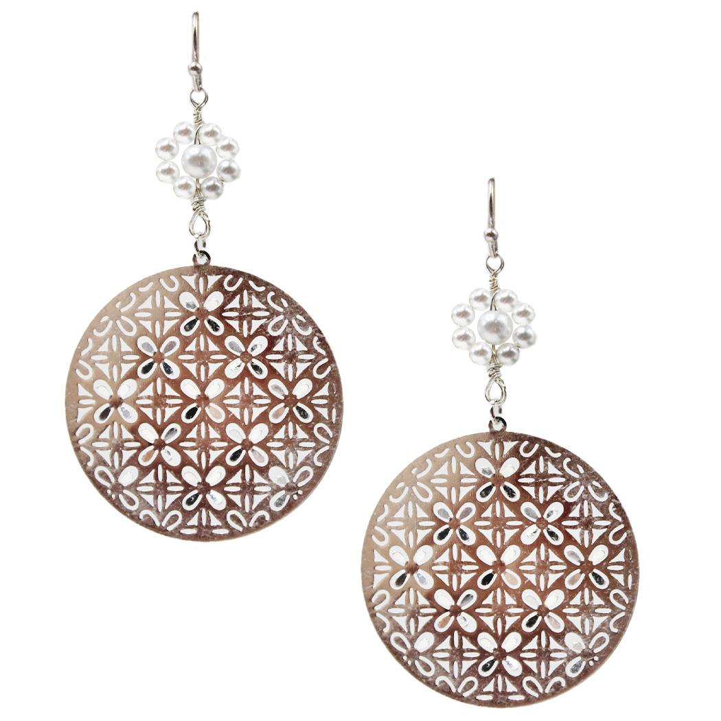 METAL ROUND PEARL FLOWER DANGLE EARRING