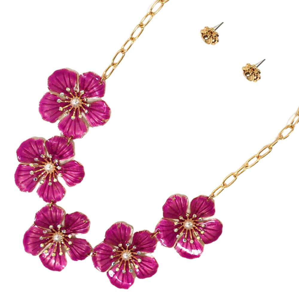TEXTURED METAL FLORAL LINK STATEMENT NECKLACE EARRING SET