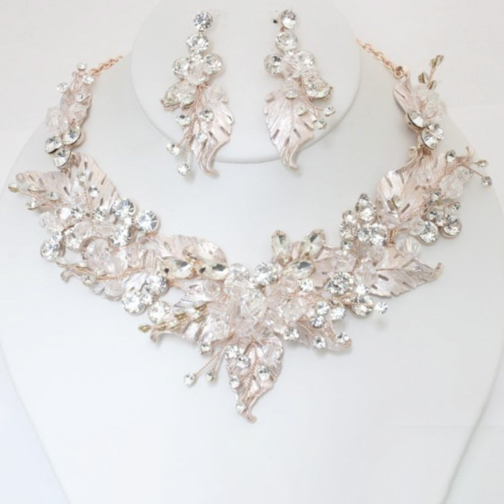 RHINESTONE FLORAL LEAF NECKLACE EARRING SET
