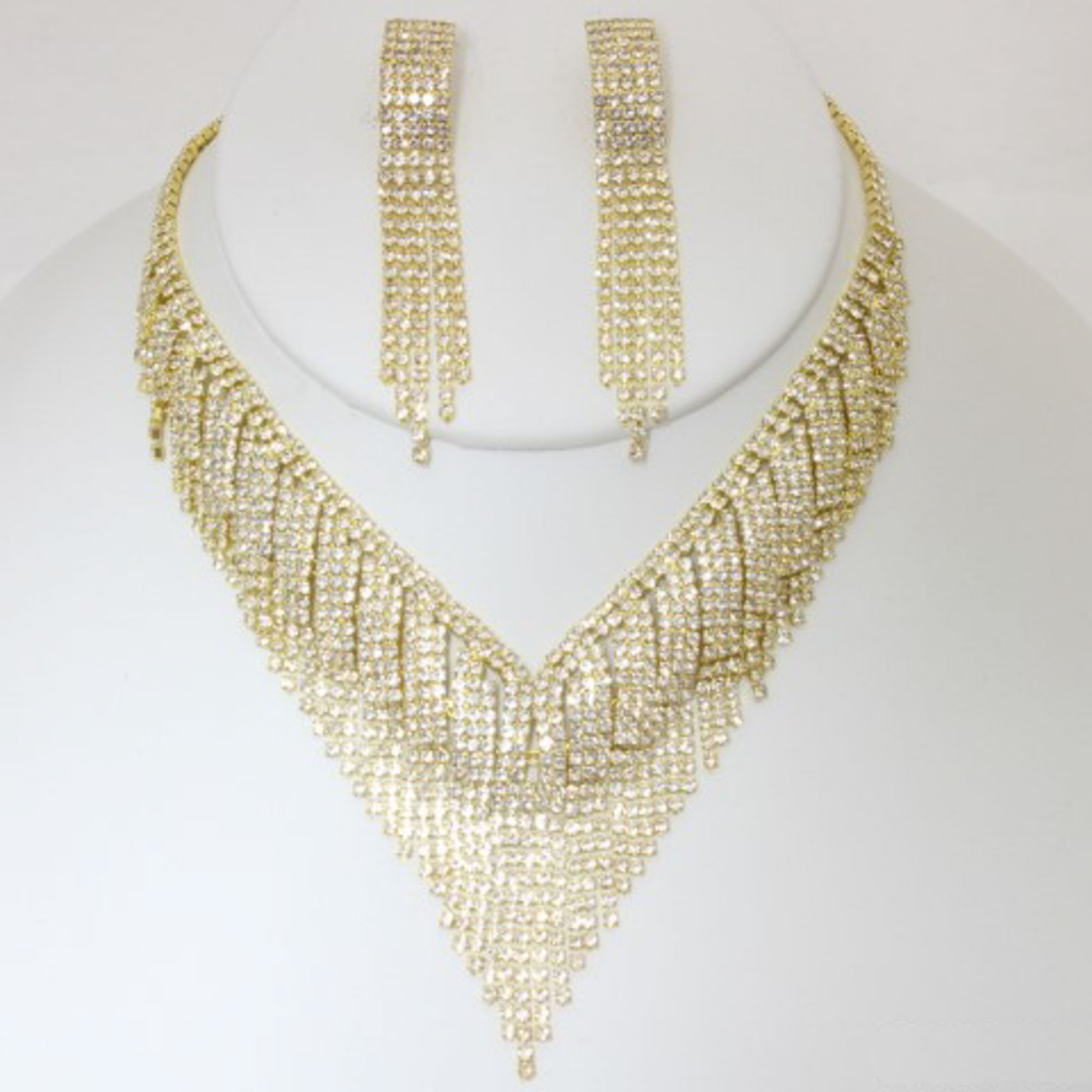 RHINESTONE V FRINGE NECKLACE EARRING BRACELET SET