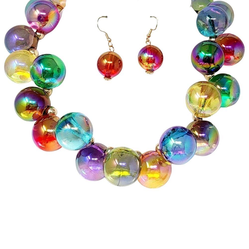 IRIDESCENT TEARDROP BEAD BIB STATEMENT NECKLACE EARRING SET