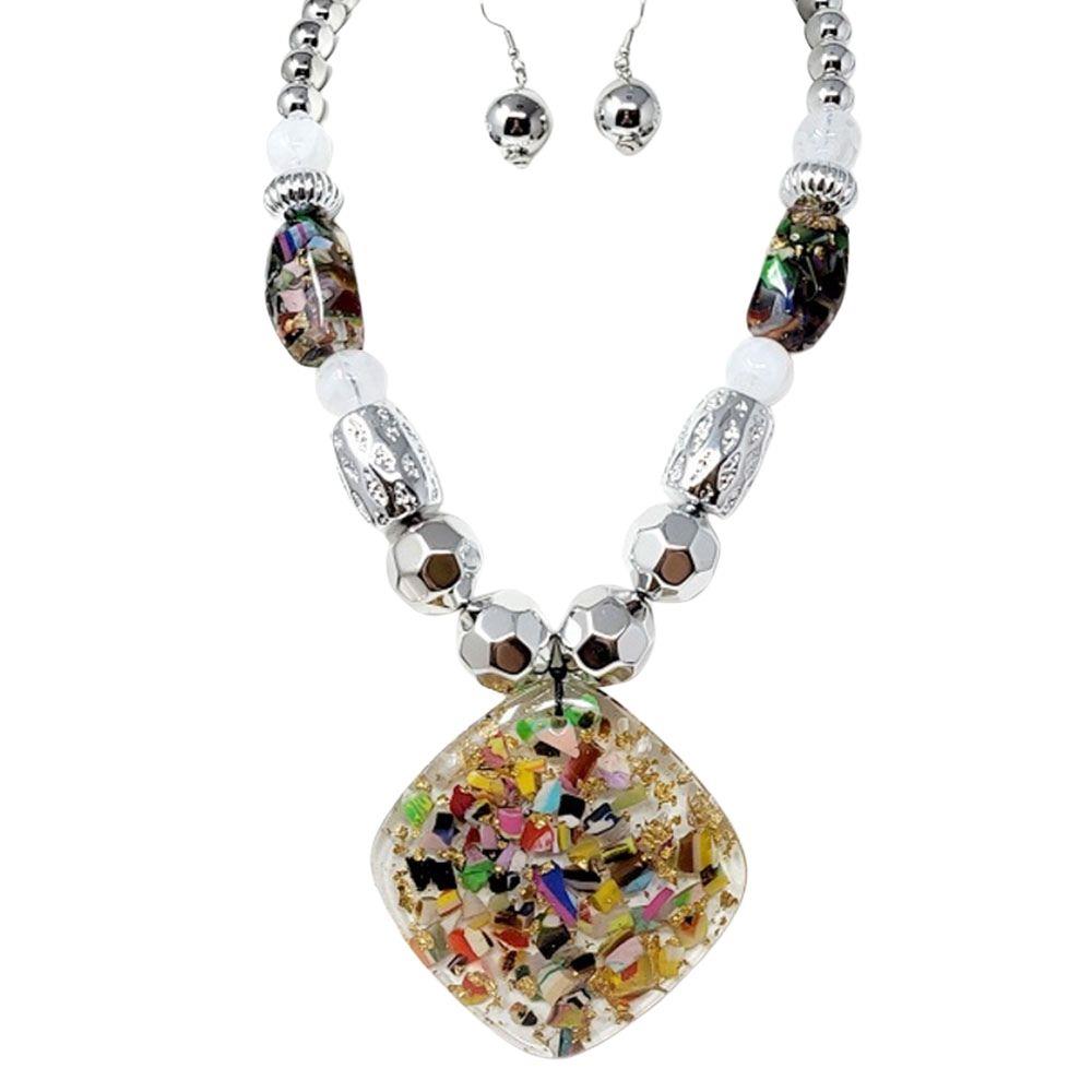 RESIN SQUARE BEAD METAL PENDANT STATEMENT NECKLACE EARRING SET