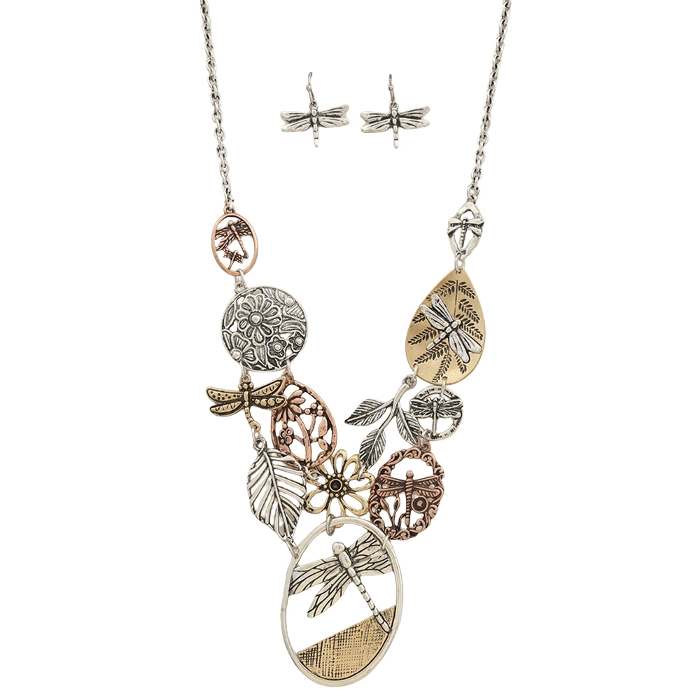 DRAGONFLY LEAF VINTAGE CHAIN NECKLACE EARRING SET
