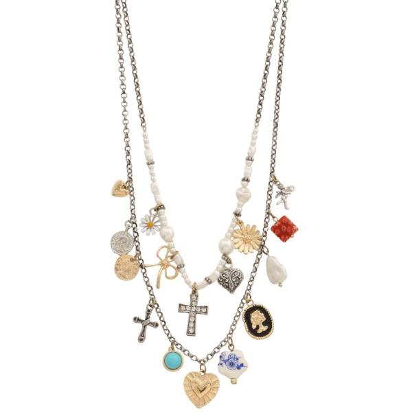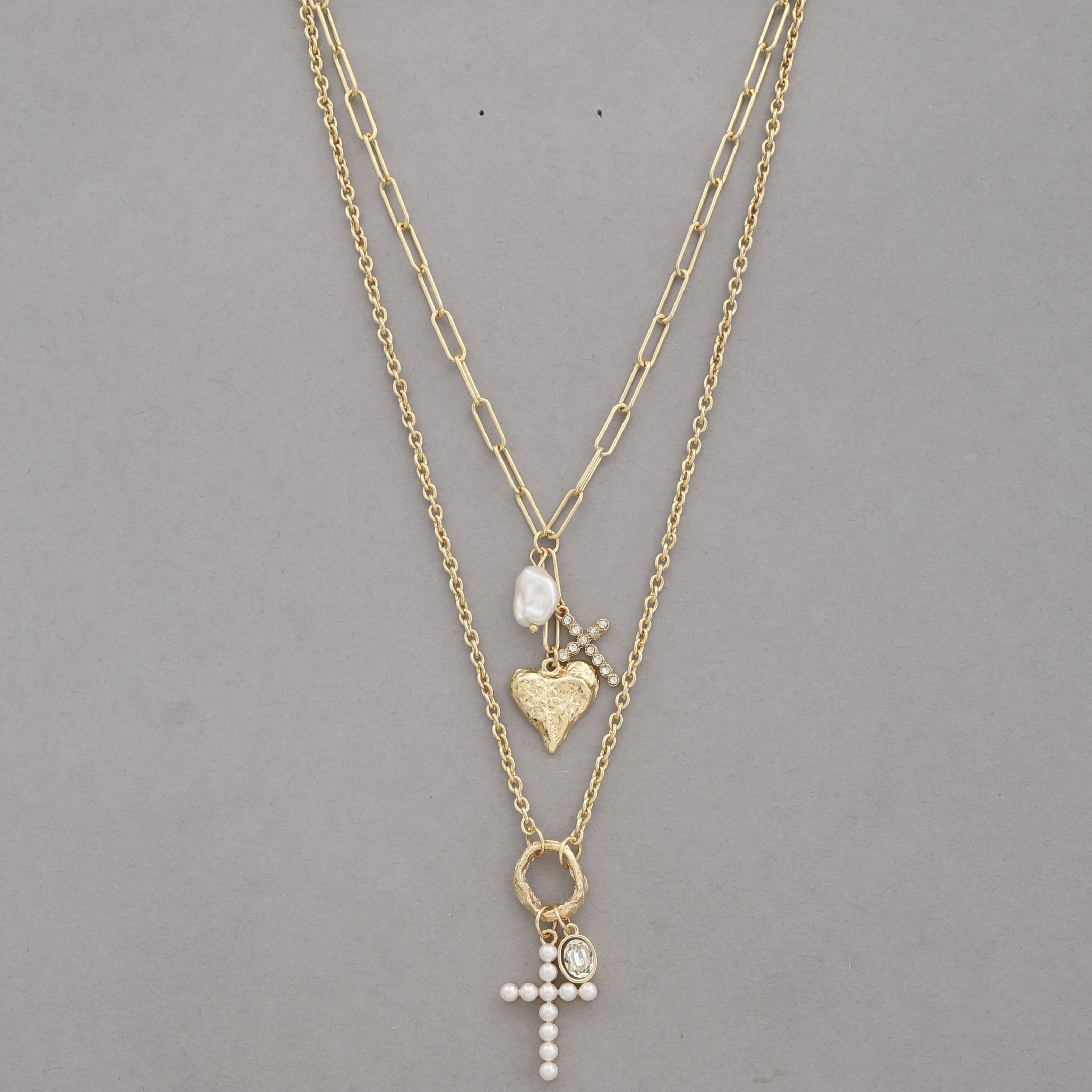 HEART CROSS MULTI CHARM LAYERED METAL NECKLACE