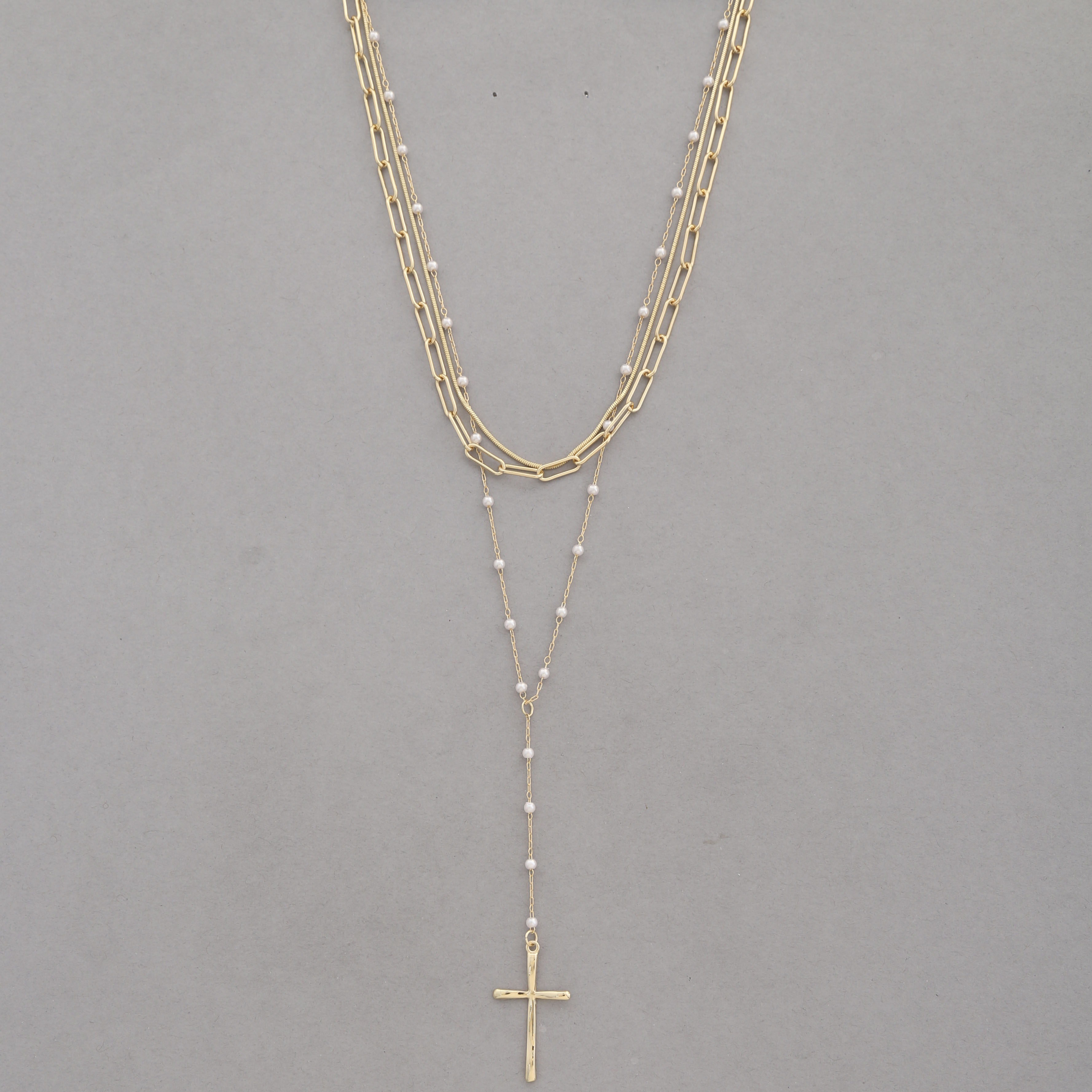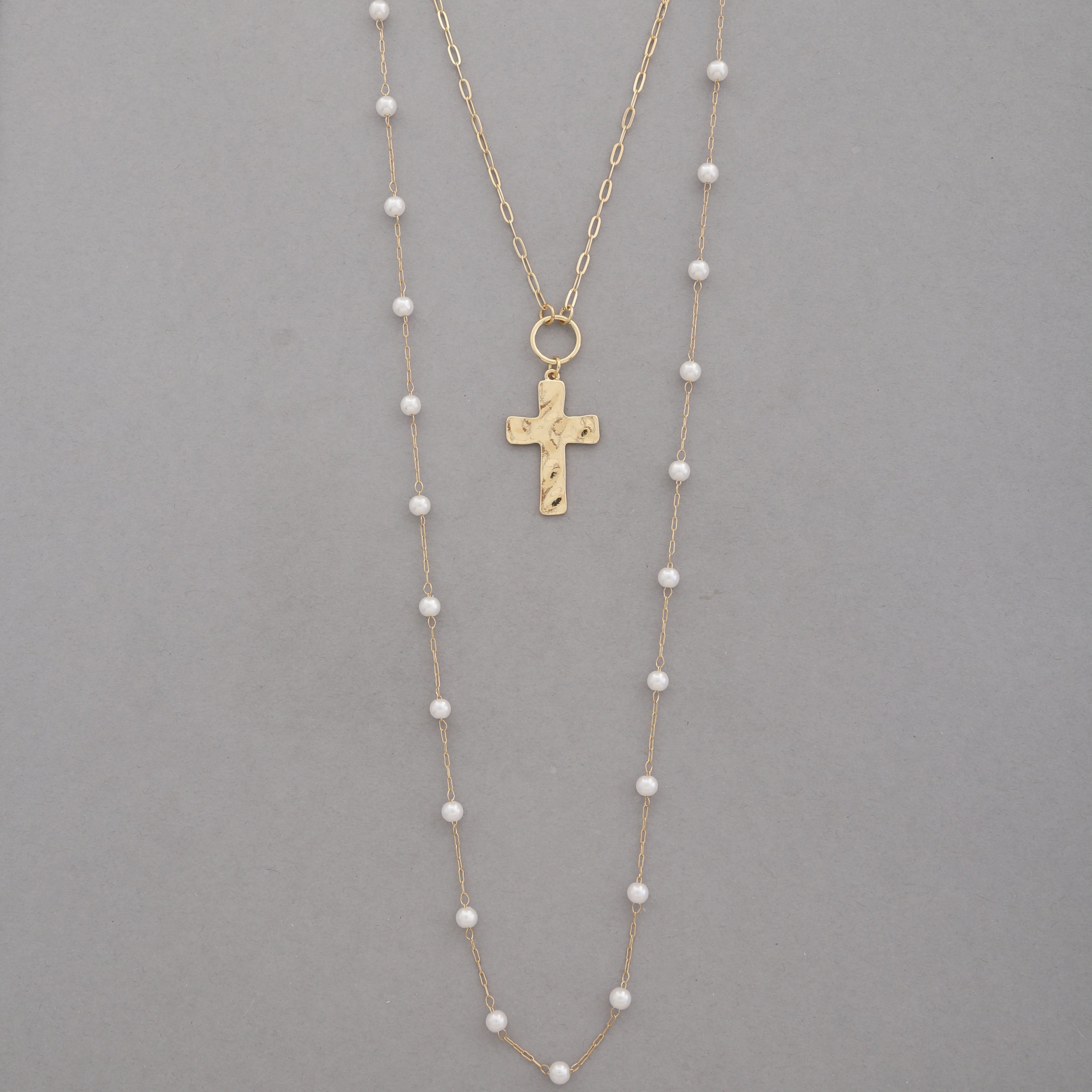 SDJ CROSS PENDANT PEARL BEAD LAYERED METAL NECKLACE