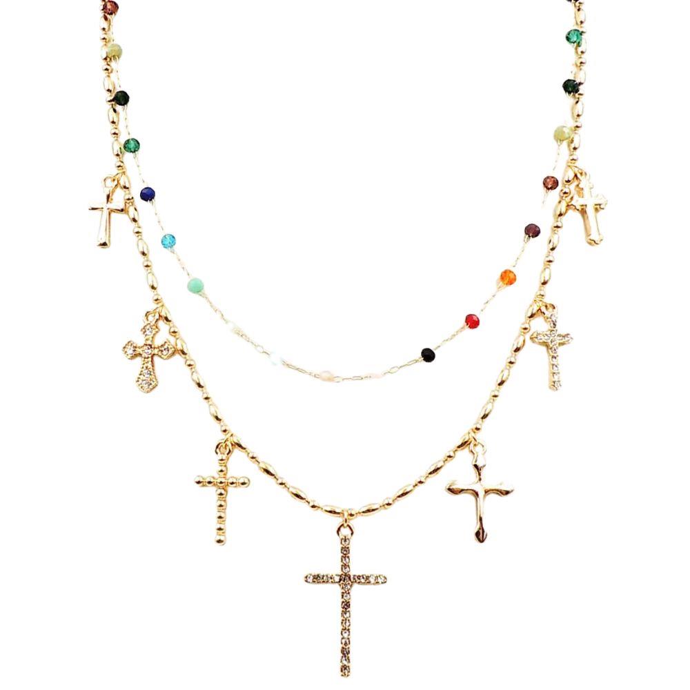 BEADED CROSS MULTI CHARM LAYERED NECKLACE