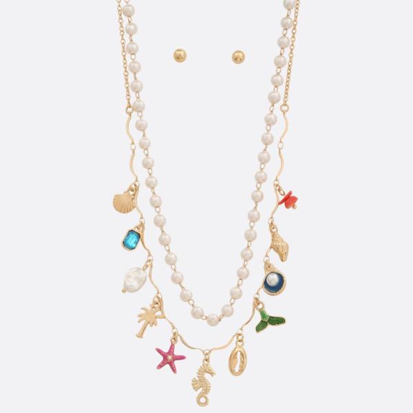 SEA LIFE CHARM PENDANT PEARL BEAD LAYERED NECKLACE