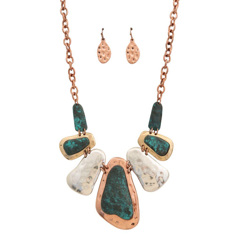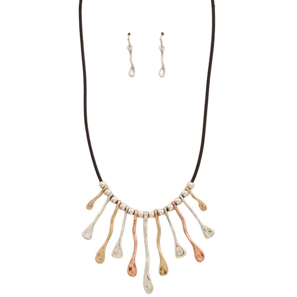 TEXTURED METAL LAYERED MULTI CHAIN NECKLACE EARRING SET