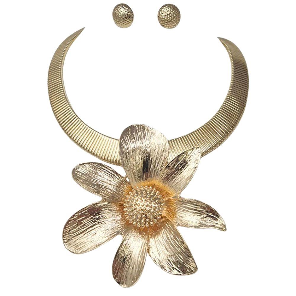 METAL FLOWER PENDANT STATEMENT NECKLACE EARRING SET