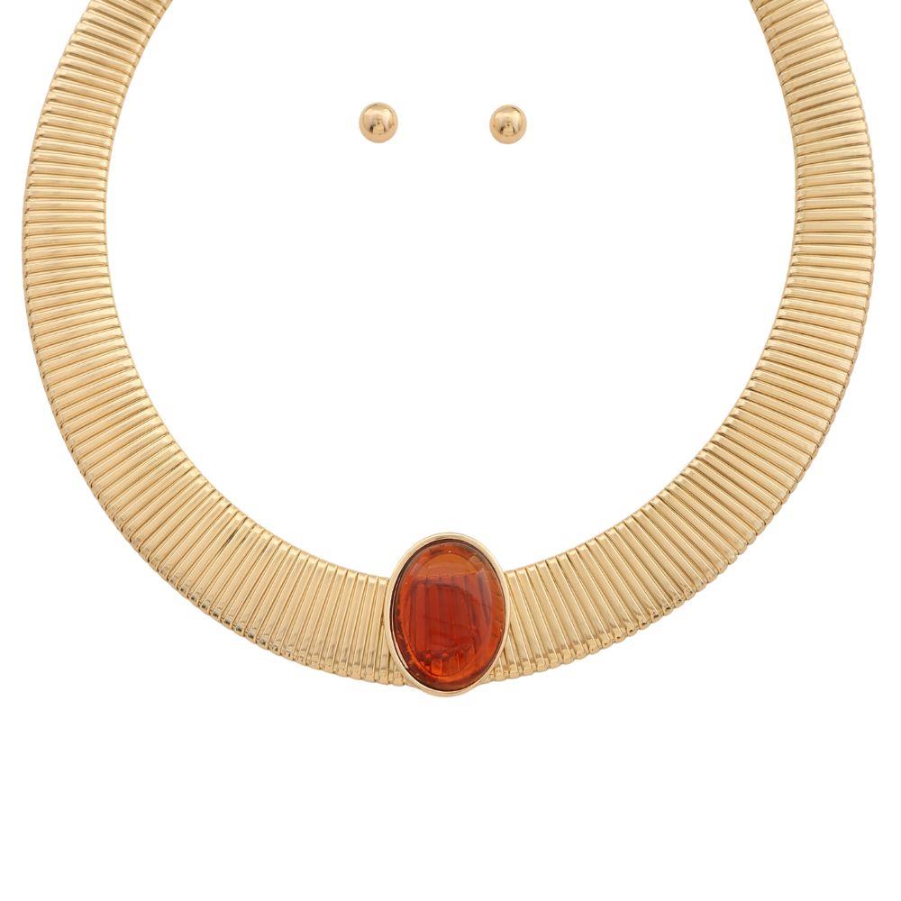ACETATE OVAL STONE FLAT CHAIN METAL NECKLACE