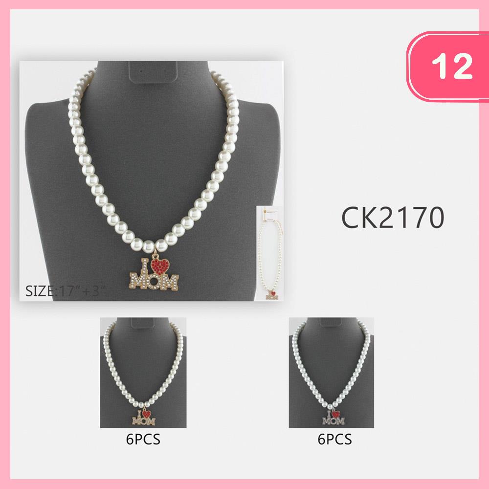 I LOVE MOM HEART PENDANT PEARL BEAD NECKLACE (12 UNITS)